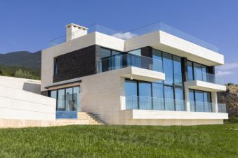 На эксплуатируемой кровле виллы будут размещены элементы озеленения и газоны. Фасад виллы облицован природным камнем крымским белым известняком, известный как Альмийский, а также темным сланцем. Панорамные оконные системы из высококачественных алюминиевых профилей.