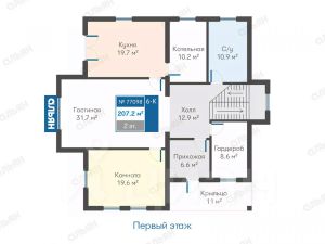 Первый этаж: кухня 19,7 м2, гостинная 31,7 м2, котельная 10,2 м2, санузел 10,9 м2, прихожая 6,6 м2, гардеробная 8,6 м2, холл 12,9 м2, комната 19,6 м2.