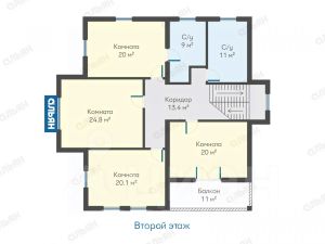 Второй этаж: 4 комнаты - 20 м2, 24,8 м2, 20,1 м2, 20 м2, коридор 13,4 м2, 2 санузла 9 м2 и 11,1 м2.