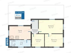 Кухня 14 м2, санузел 8 м2,коридор 3,3 м2, комната 16,7 м2, комната 11,8 м2, комната 8,2 м2.