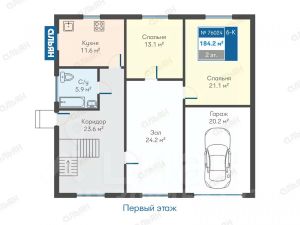 1-й этаж: кухня 11,6 м2, санузел 5,9 м2, коридор-лестничная клетка 23,6 м2, зал 24,2 м2, спальня 13,1 м2, спальня 21,1 м2, гараж 20,1 м2.