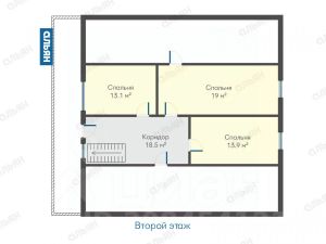 2-й этаж: спальня 13,1 м2, спальня 19 м2, спальня 13,9 м2, подсобное помещение 14 м2, балкон на ширину всего дома, требует ремонта.