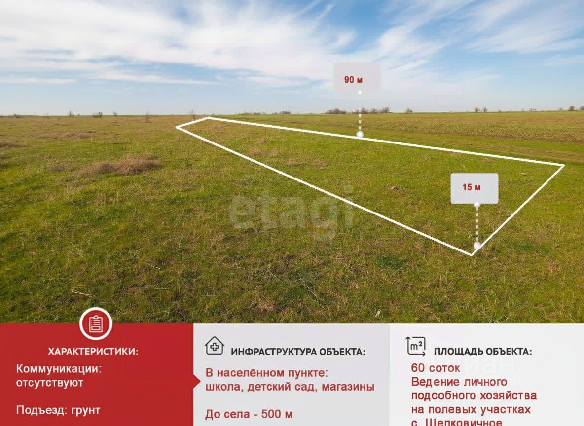 Участок ровный, прямоугольный, расположен в 500 м от асфальтированной дороги, идущей через с. Шелковичное, Сакский район, Республика Крым. До транспортной развязки нового участка Тавриды 2,5 км.