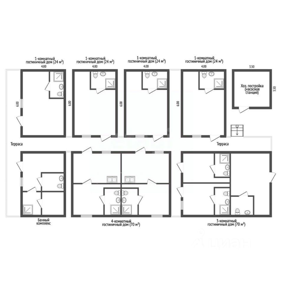 Жилой фонд: Комплекс включает пять уютных бунгало (по 24 кв.м), полностью оборудованных для комфортного пребывания: каждый домик располагает индивидуальным санузлом, системой кондиционирования "зима-лето" и всем необходимым для беззаботного отдыха. Дополнительно имеются два просторных дома (по 70 кв.м), идеально подходящие для семейного или группового размещения.