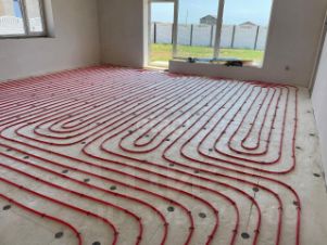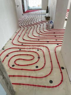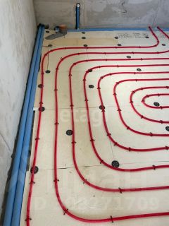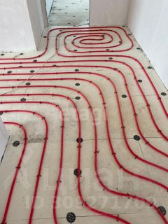 В санузлах, кухне-гостиной, коридоре и котельной - разведён водяной тёплый пол, в спальных комнатах установлены радиаторы.