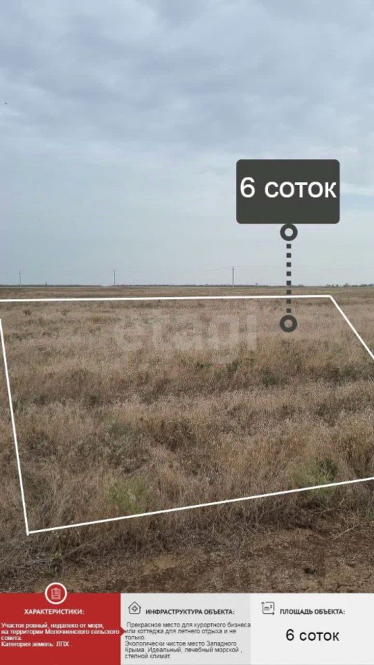 Продается участок 6 соток ЛПХ в Молочненское сельское поселение, Сакский район, Республика Крым рядом с Евпаторией, ровный, недалеко от моря, на территории Молочненского сельского совета.