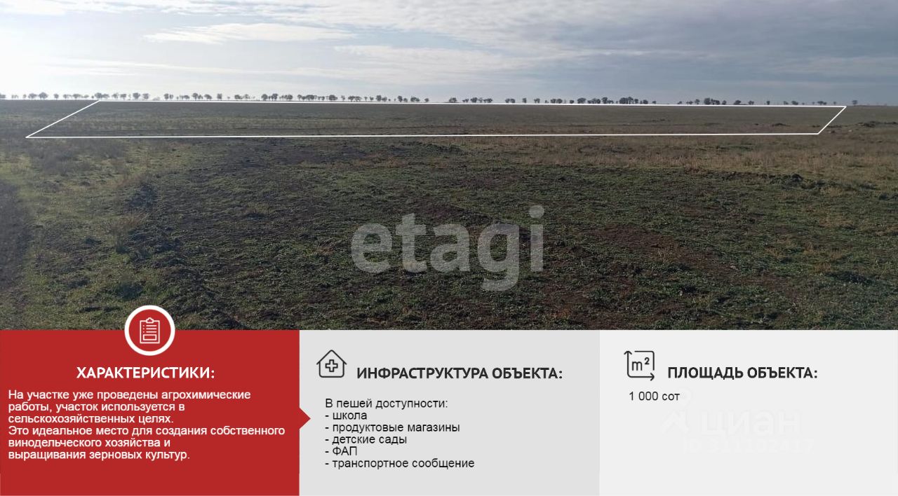 Участок ровной прямоугольной формы. На участке уже проведены агрохимические работы, участок используется в сельскохозяйственных целях. Это идеальное место для создания собственного винодельческого хозяйства и выращивания зерновых культур.