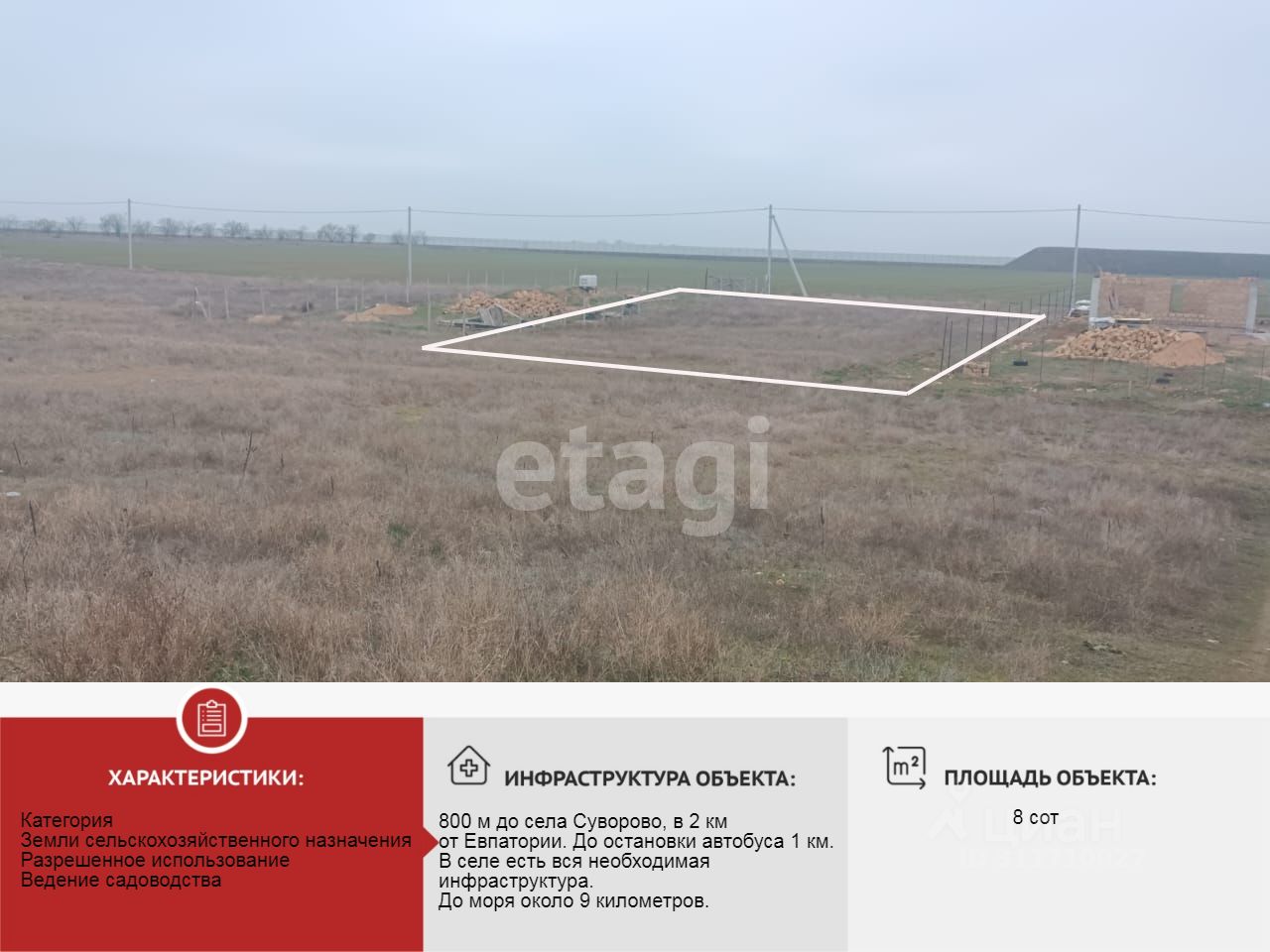 800 метров до села Суворово, в 2 километрах от Евпатории. До остановки Евпаторийского автобуса 1 км. Маршрут автобуса проходит через весь город. В селе есть вся необходимая инфраструктура. До моря около 9 километров.