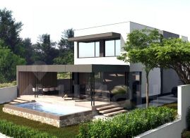 - первый этаж: просторная кухня-гостиная с панорамными окнами и выходом на террасу и к бассейну, санузел, хозяйственное помещение, гостевая;