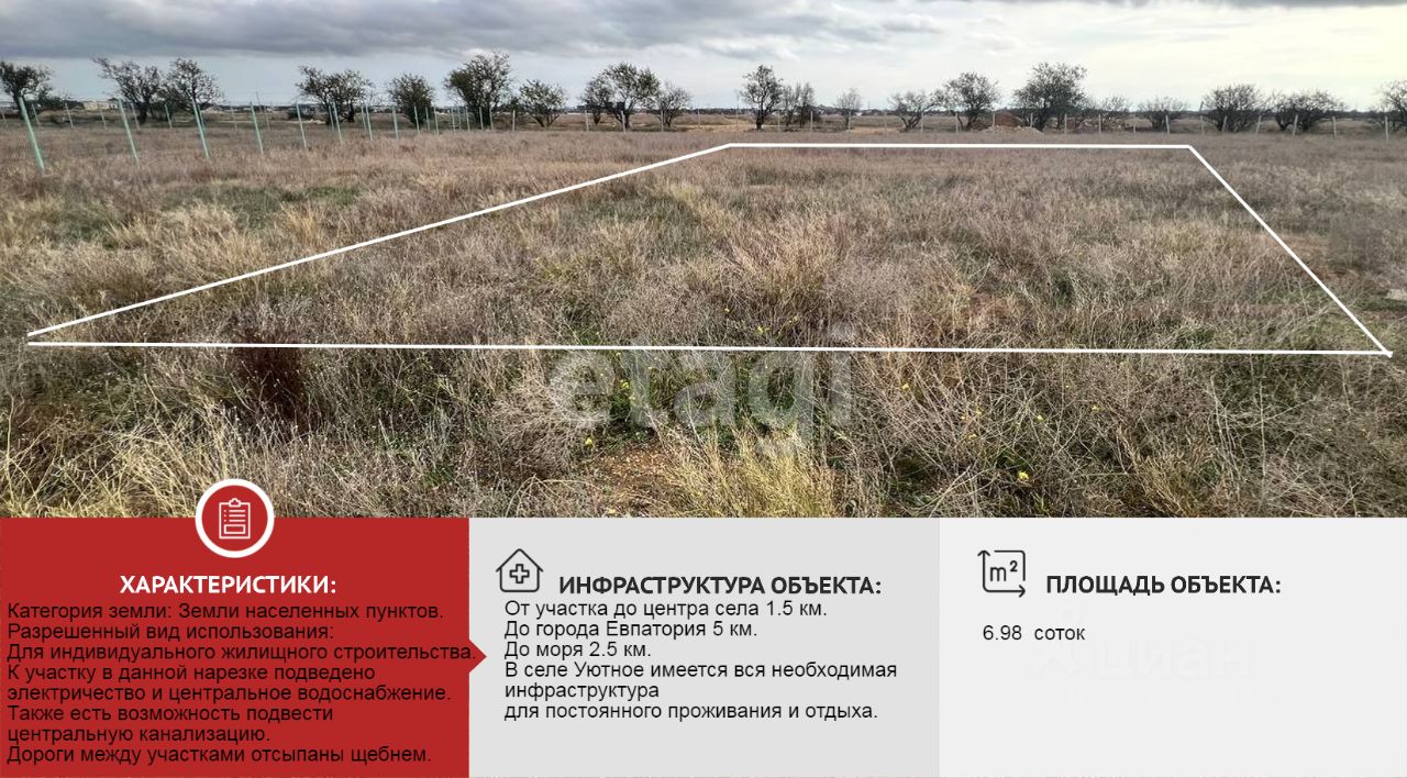 От участка до центра села 1.5 км. До города Евпатория 5 км. До моря 2.5 км.В селе Уютное имеется вся необходимая инфраструктура для постоянного проживания и отдыха.