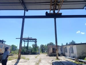 На участок заведены все городские коммуникации: ТП 140кВ, городская вода,канализация. Территория огорожена, на ней есть ОКСы общей площадью 5513кв.м. ( здания, строения, гаражи, ангар) участок асфальтирован. На объекте 4 кран-балке, грузоподъемность: 5,2,2,1 тонны.
