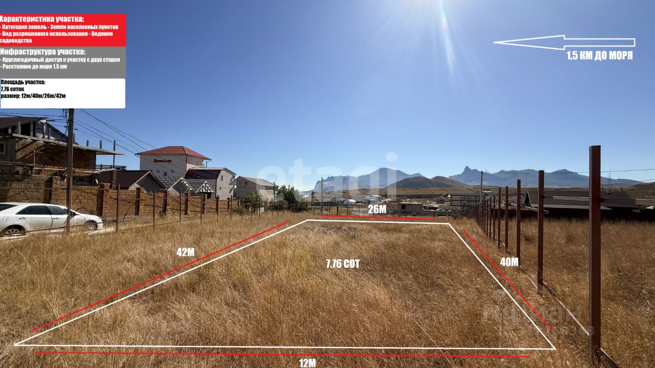 Земельный участок площадью 7,76 соток расположен в поселке городского типа Коктебель на территории садоводческого товарищества. Ключевым преимуществом является панорамный вид на массив Кара-Даг, который открывается с территории. Удаленность от морского побережья составляет 1,5 км, что позволяет комфортно дойти пешком за 15-20 минут. Участок оптимально подходит для капитального строительства частного дома.