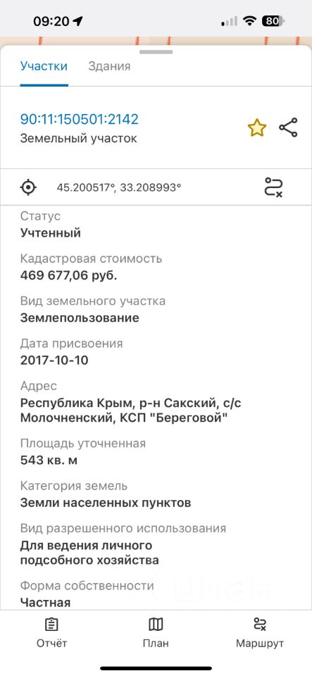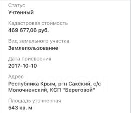 Республика Крым, р-н Сакский, с/с Молочненский, КСП "Береговой", земельный участок 543 м², категория земель- Земли поселений (земли населенных пунктов), для ведения личного подсобного хозяйства, имеется подъезд с улицы, электричество - заключен договор с РЭС - 15 кВт. Кадастровый номер - 90:11:150501:2142 , а рядом имеется второй такой же земельный участок кад/номер 90:11:150501:2143 -