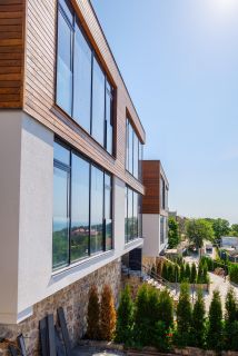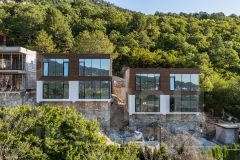 Коттедж спроектирован в стиле минимализм с элементами хай-тек: прямые архитектурные формы, натуральные материалы в отделке.