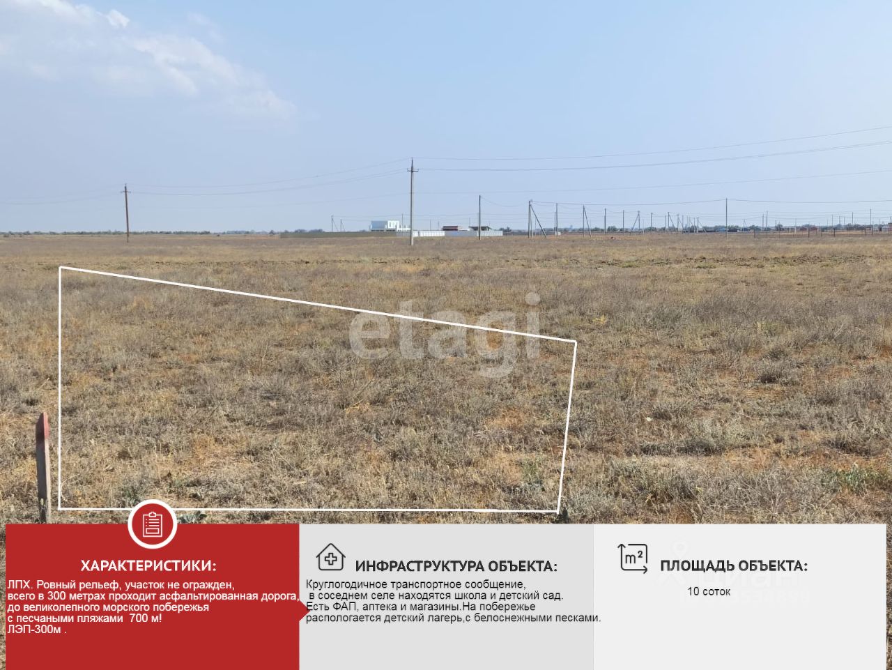 Участок сельскохозяйственного назначения, вид разрешенного использования ведение - личного подсобного хозяйства . Ровный рельеф, участок не огражден, всего в 300 метрах от участка проходит асфальтированная дорога, а до великолепного морского побережья с песчаными пляжами 700 м!