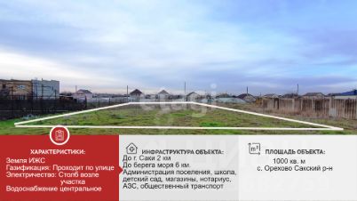 Село Орехово является центральной усадьбой, где расположены общеобразовательная школа, детский сад, администрация поселения, стадион, Дворец культуры, магазины, рынок, медицинская амбулатория, остановка общественного транспорта, осуществляющего перевозки по удобному графику движения. До города Саки 2 км, до морского побережья 6 км. Вдоль населенного пункта проходит участок автодороги Евпатория-Симферополь с возможностью выезда на Севастополь. Обращайтесь, для вас незамедлительно будет организован личный либо онлайн показ и предоставлена исчерпывающая информация по всем интересующим Вас вопросам.