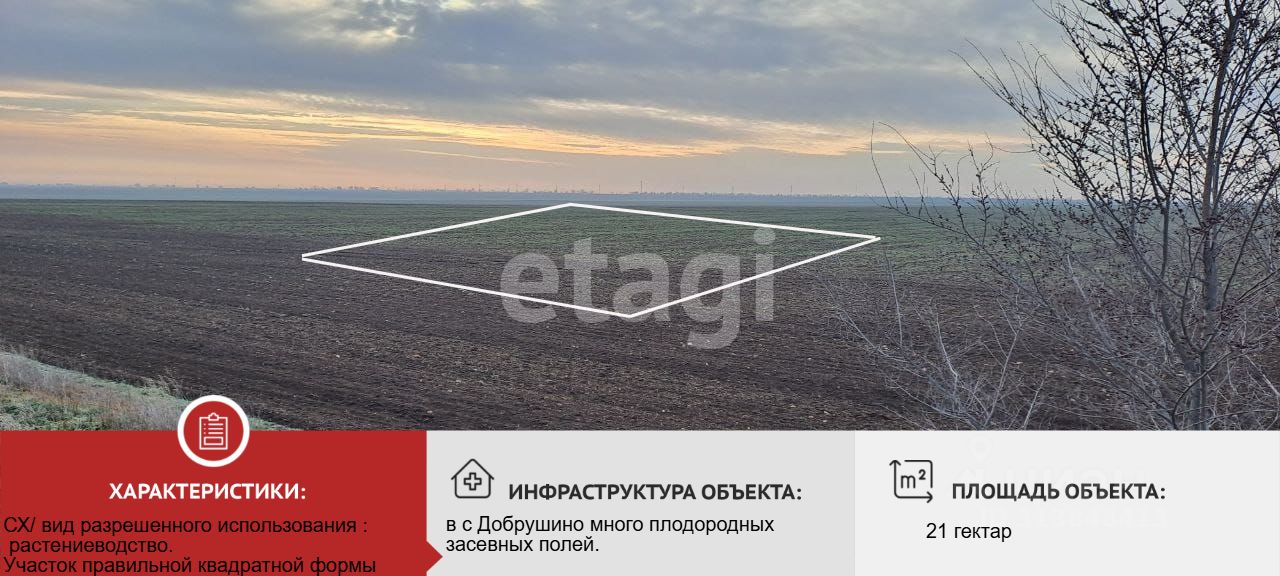 Участок сельскохозяйственного назначения, вид разрешенного использования : растениеводство. Участок правильной квадратной формы (484,8 на 433,4 метров) ровный рельеф, не огражден.