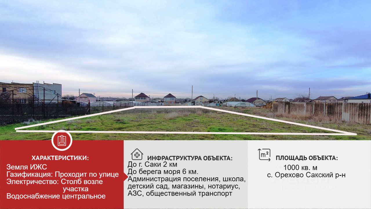 Вашему вниманию земельный участок площадью 10 соток для индивидуального жилищного строительства, расположенный на территории села Орехово Сакского района, западное побережье Крыма. Участок имеет ровную поверхность, правильную прямоугольную форму, расположен в частном жилом массиве. Подъезд к участку осуществляется по накатанной грунтовой дороге. Вдоль границ участка проходит линия электропередач, центральный водопровод, имеется техническая возможность газификации. Село Орехово является центральной усадьбой, где расположены общеобразовательная школа, детский сад, администрация поселения, стадион, Дворец культуры, магазины, рынок, медицинская амбулатория, остановка общественного транспорта, осуществляющего перевозки по удобному графику движения. До города Саки 2 км, до морского побережья 6 км. Вдоль населенного пункта проходит участок автодороги Евпатория-Симферополь с возможностью выезда на Севастополь. Обращайтесь, для вас незамедлительно будет организован личный либо онлайн показ и предоставлена исчерпывающая информация по всем интересующим Вас вопросам.