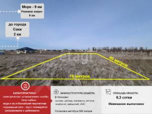 Участок прямоугольной формы (16 на 40 метров), площадью 6.3 соток. Располагается на третьей линии от дороги соединяющей поселок Лесновка и город Саки.