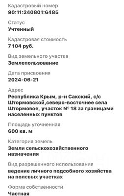 Адрес Республика Крым, р-н Сакский, с/с Штормовской,северо-восточнее села Штормовое, участок 18 за границами населенных пунктов