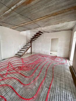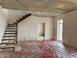 Утеплен, разведена электрика и сантехника, уложен теплый пол, сделана стяжка пола.