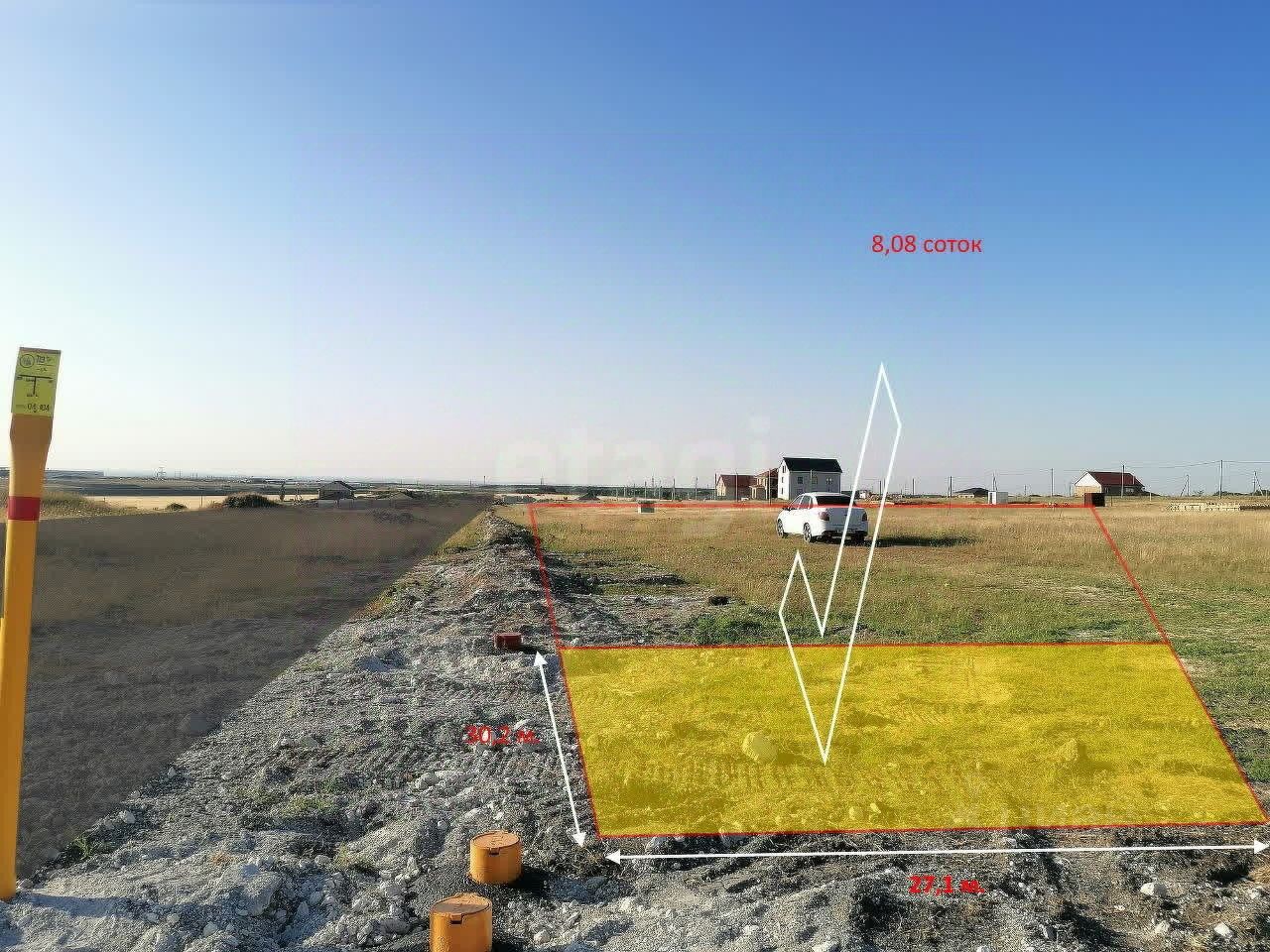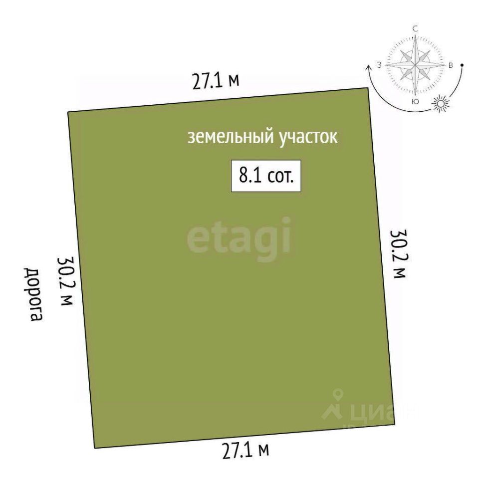 Площадь земельного участка - 8,1 соток, правильной четырёхугольной формы, ровный, без уклона.