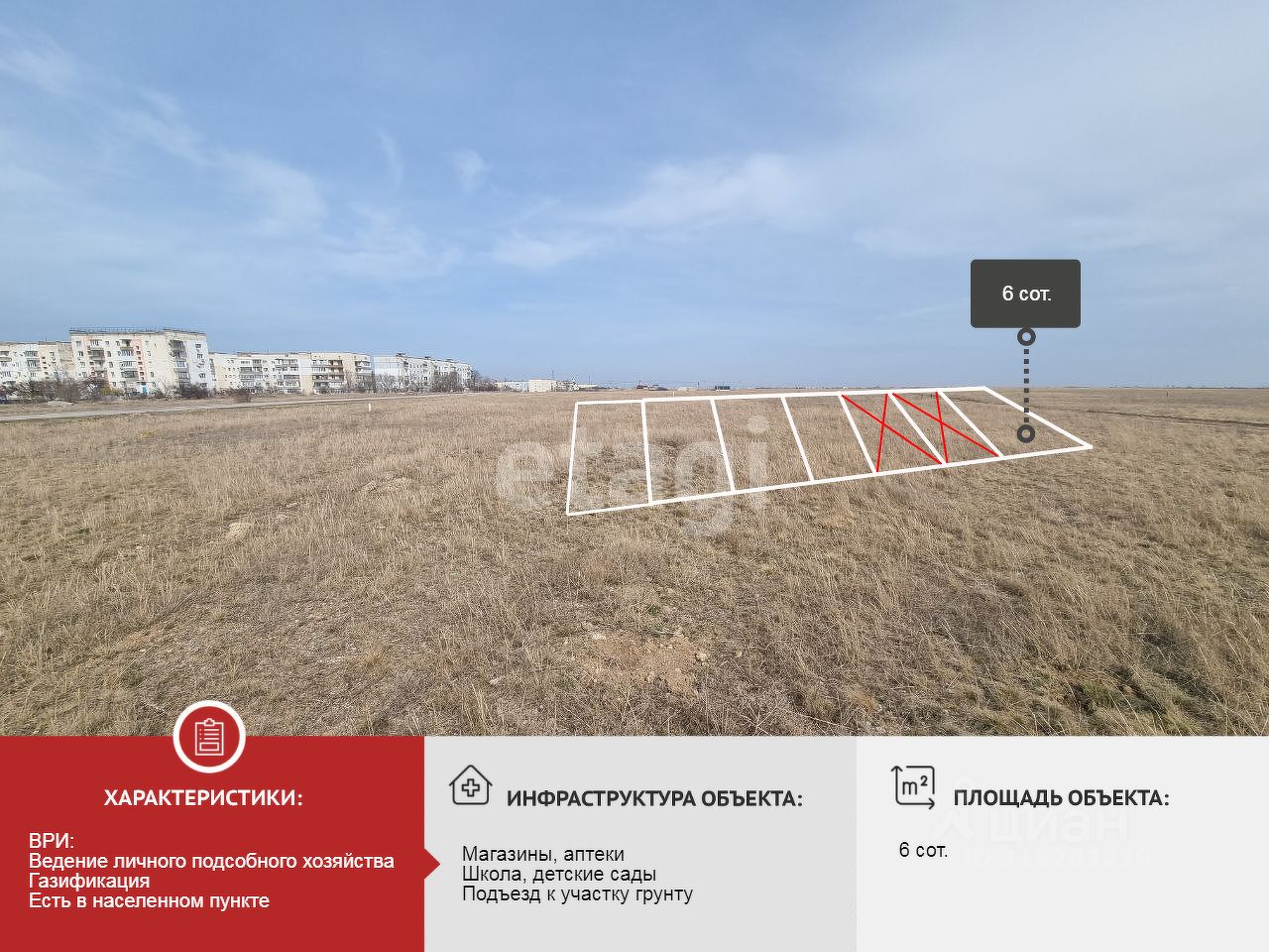 Участок расположенный в километре от побережья озера Донузлав. В границе села есть вся необходимая инфраструктура, такая как: детские сады, школа, детские развлекательные центры. Магазины, аптеки, ФАП, парки и рынок находится в пешей доступности. Транспортное сообщение круглогодичное.