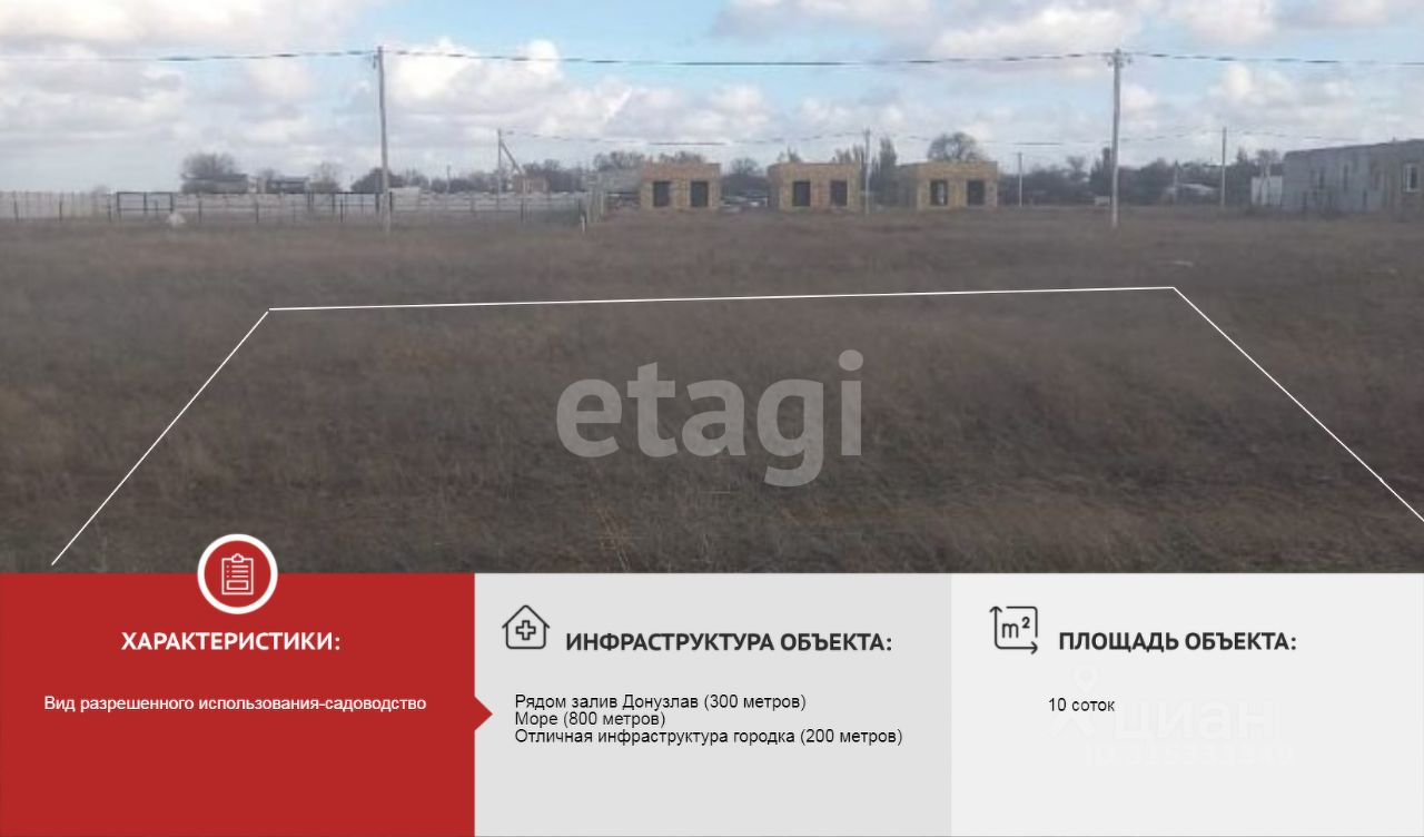 В пешей доступности залив Донузлав, в километре от участка море. Инфраструктура отлично развита. Регулярно ходит городской транспорт. Рядом кафе "Шашлычный дворик".