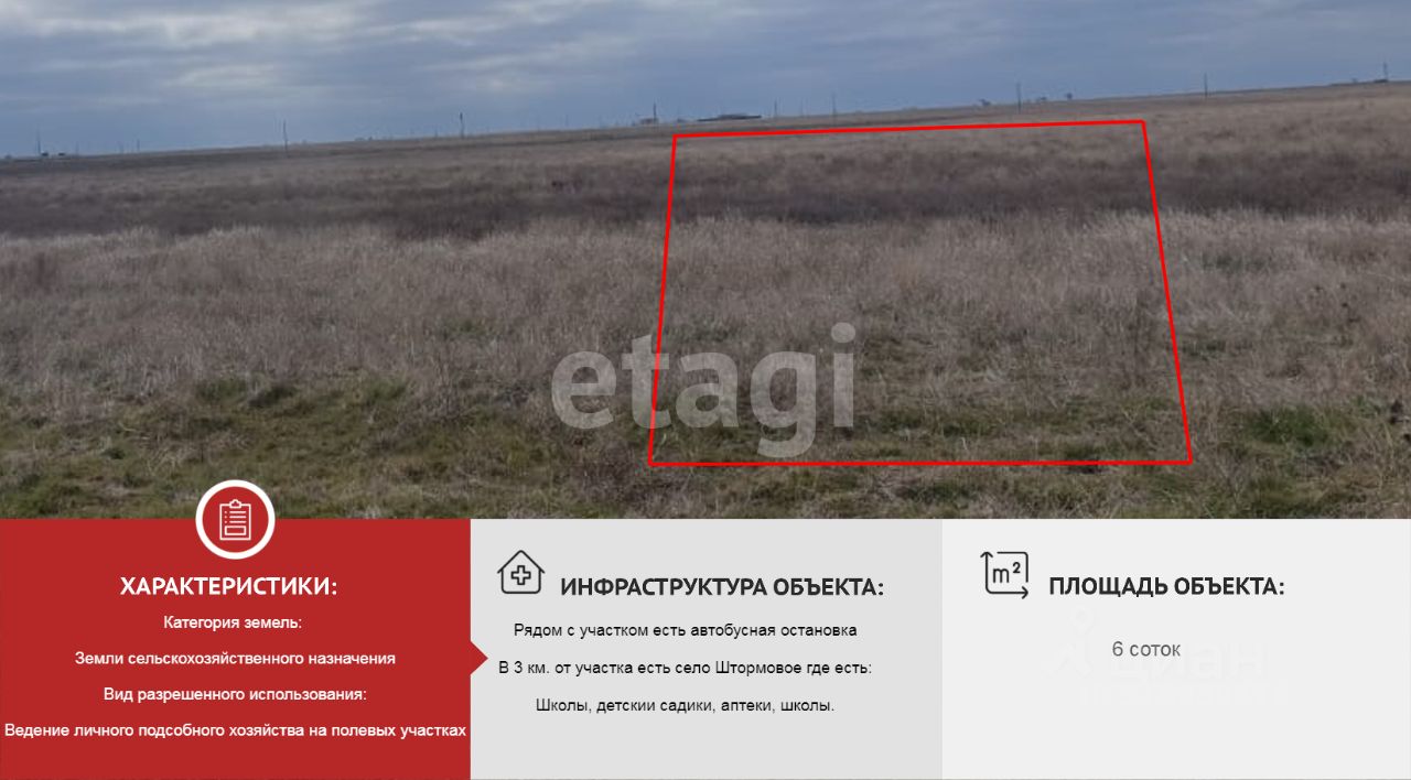 Продается участок площадью 6 соток, в 3 км. село Штормовое.