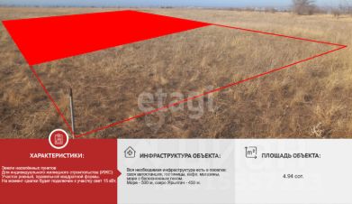Площадь участка 4,94 сотки. Размер 23 метра на 22 метра. Категория земель: земли населенных пунктов, вид разрешенного использования - ИЖС. Участок ровный, правильной квадратной формы. На момент сделки будет подключен к участку свет 15 кВт. Море - 500 м, озеро Ярылгач - 450 м.