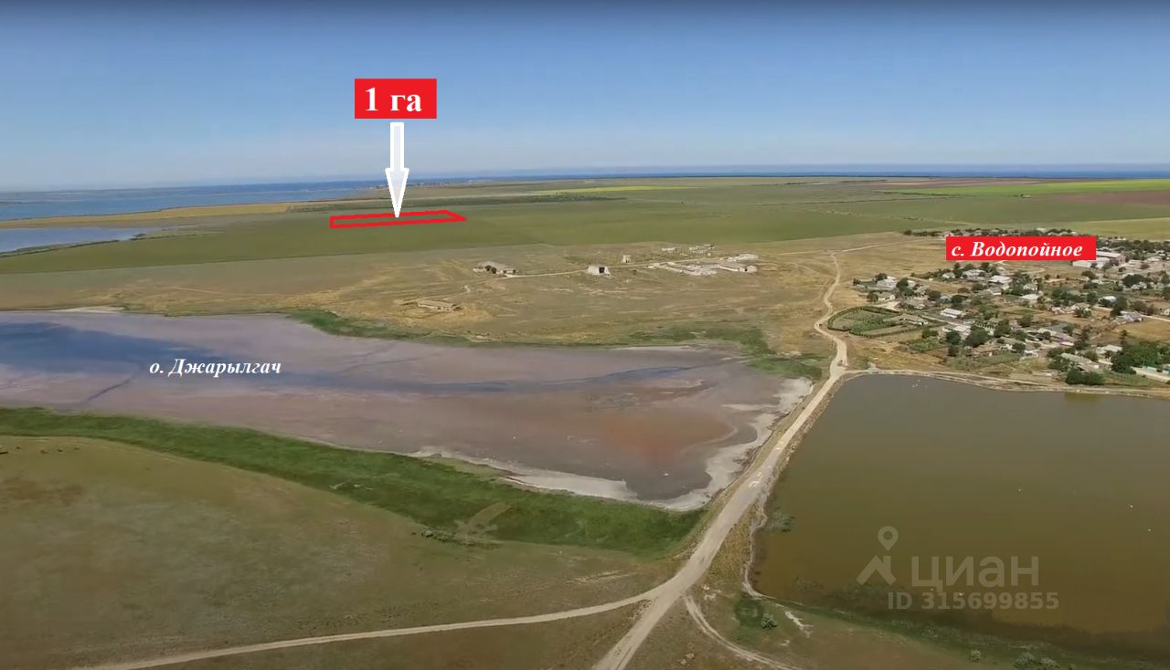 Продается земельный участок площадью 1 га. Участок относится к территории Межводненского сельского совета, находится недалеко от села Водопойное Черноморского района, на берегу озера Джарылгач. Назначение земли: сельскохозяйственное использование. До озера 400 метров, до села Водопойное 1 км., до Межводного 4,2 км., до моря 5 км.
