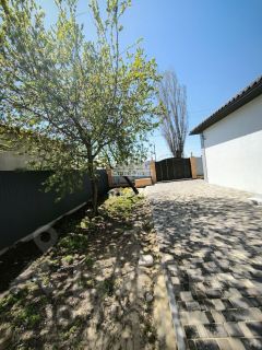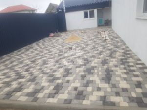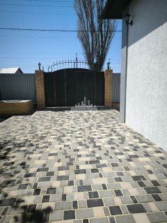 Вокруг дома выложена красивая тротуарная плитка, которая гармонично сочетается с цветом крыши и дополнениями, создавая уникальный облик. Надежные ворота и стильный забор обеспечивают безопасность и приватность.