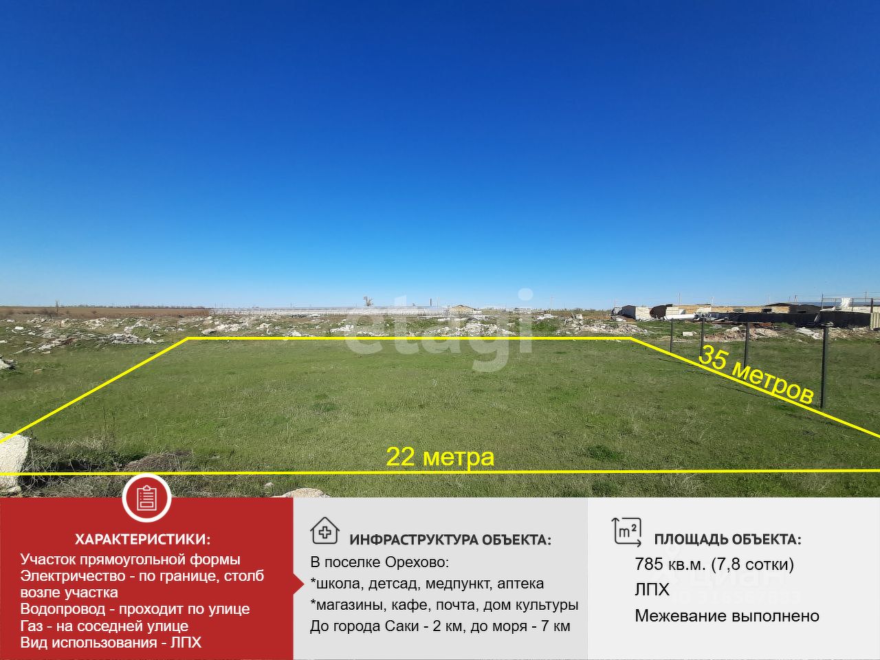 Участок площадью 785 кв.м. (7,8 сотки), вид разрешенного использования: Ведение личного подсобного хозяйства на полевых участках.