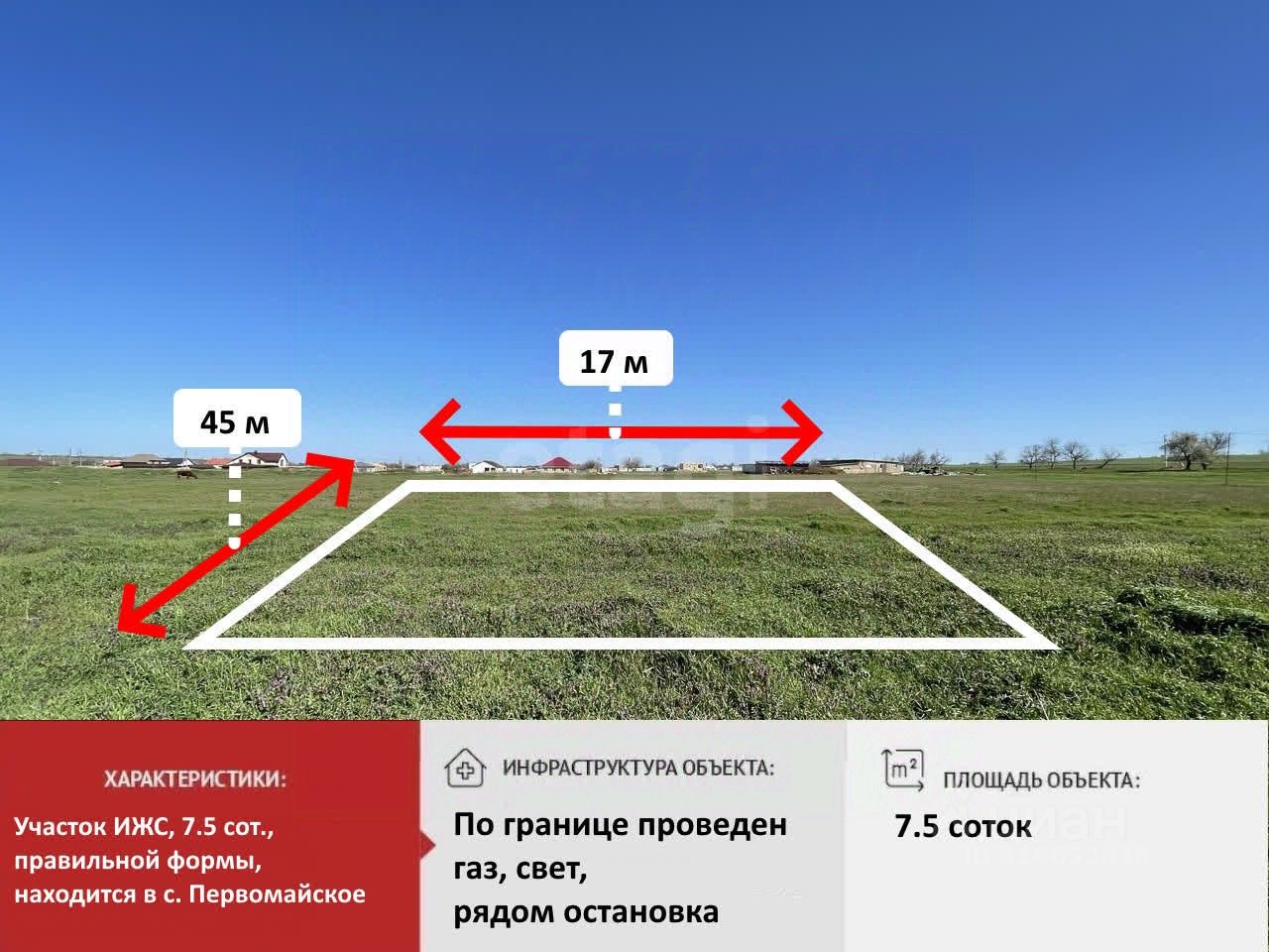 Село Первомайское радует развитой инфраструктурой: в непосредственной близости находятся школа, детский сад, магазины, аптека и фельдшерско-акушерский пункт (ФАП). Это делает участок идеальным местом для семейной жизни или отдыха на выходных. Все необходимое для комфортной жизни находится в нескольких минутах ходьбы!