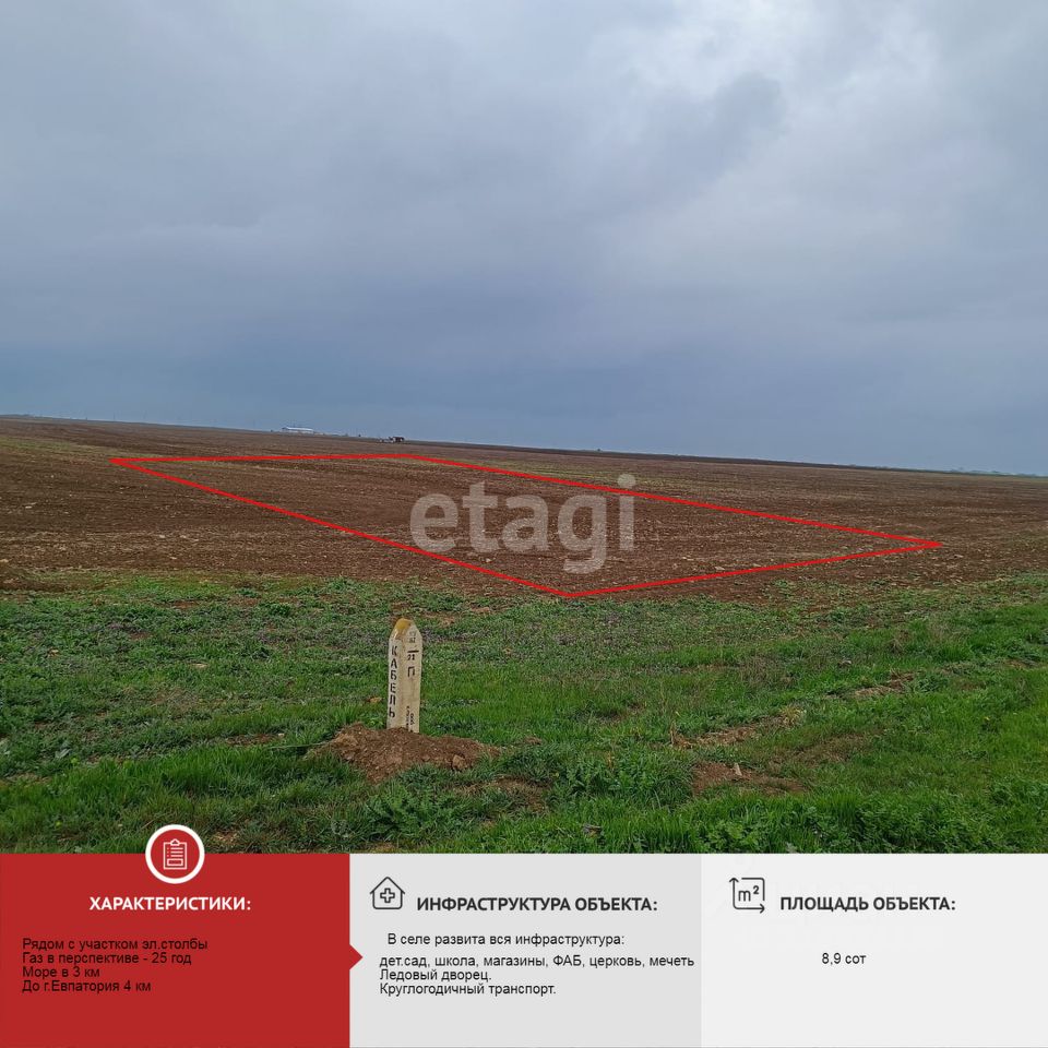 Море находится в 3 км от участка. В селе развита вся инфраструктура, есть новый детский сад, школа, ледовый дворец, магазины разной направленности.