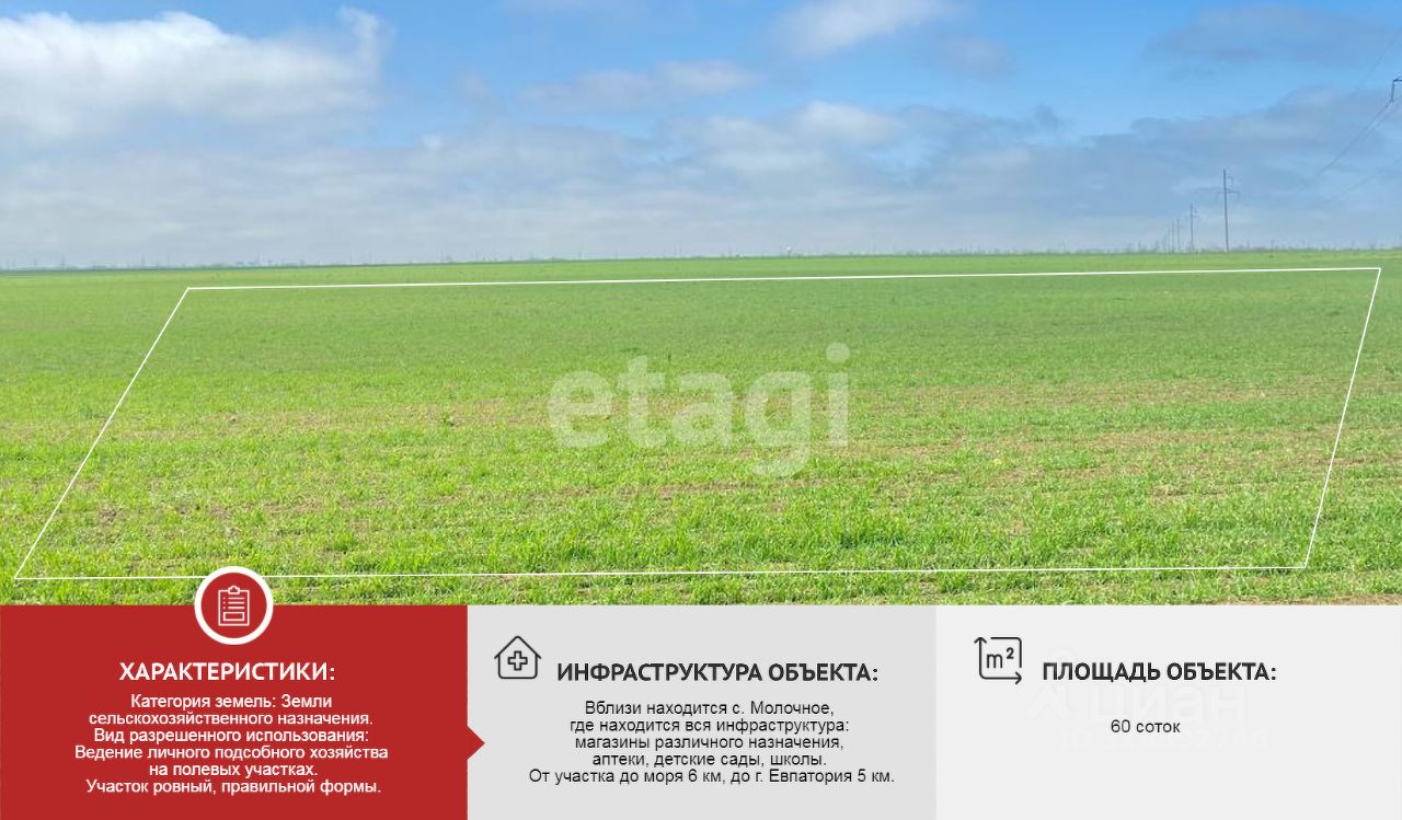 Вблизи находится с. Молочное, где находится вся инфраструктура: магазины различного назначения, аптеки, детские сады, школы. От участка до моря 6 км, до г. Евпатория 5 км.