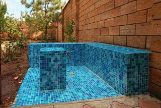 • Бассейн, подогреваемый, окружённый цветущим садом (розы, виноград, хурма, персик и другие растения).