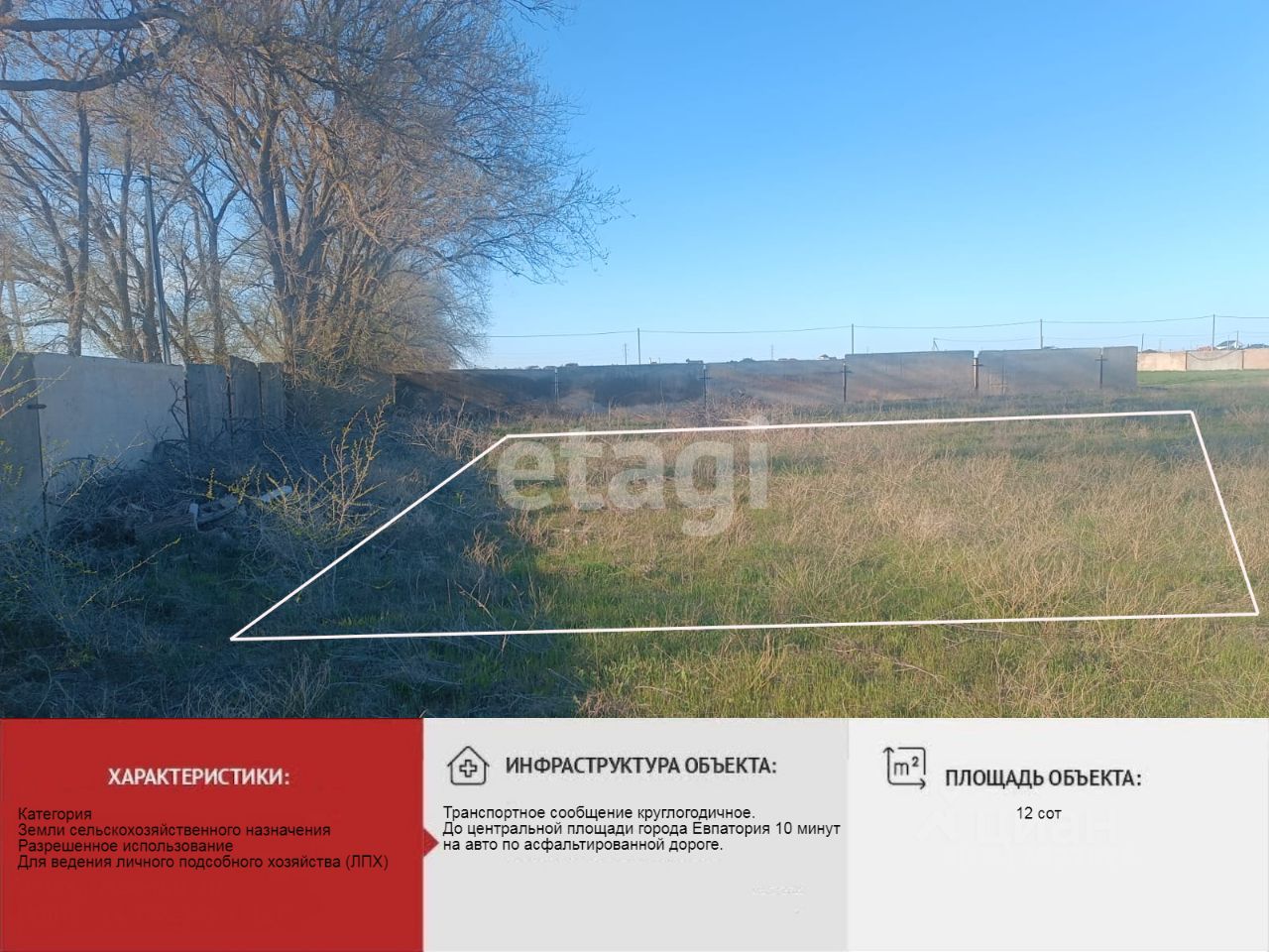 Категория земельного участка : сельскохозяйственное использование, вид разрешенного использования - личное подсобное хозяйство. Линия электропередач возле участка. На земельном участке возведен забор. Заведено электричество 15 кВт. Оборудована скважина. Рядом уже построены новые дома.