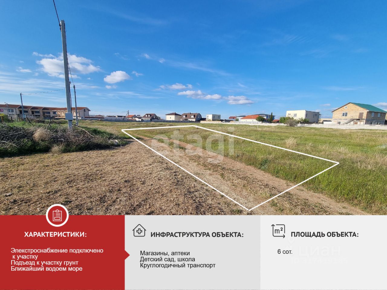 Участок ровный, с подключенным электричеством и возможностью центрального водоснабжения (или бурения собственной скважины). Рядом уже построены дома соседей можно сразу приступать к возведению своего коттеджа! Территория активно развивается, а близость к морю делает этот участок выгодным объектом как для личного отдыха, так и для курортного бизнеса (гостевые дома, мини-отели).