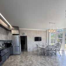 Первый этаж: кухня - столовая, каминный зал, раздельный санузел, ванная комната, котельная, гостевая комната. Отопление - теплый пол. Стены - венецианская штукатурка.