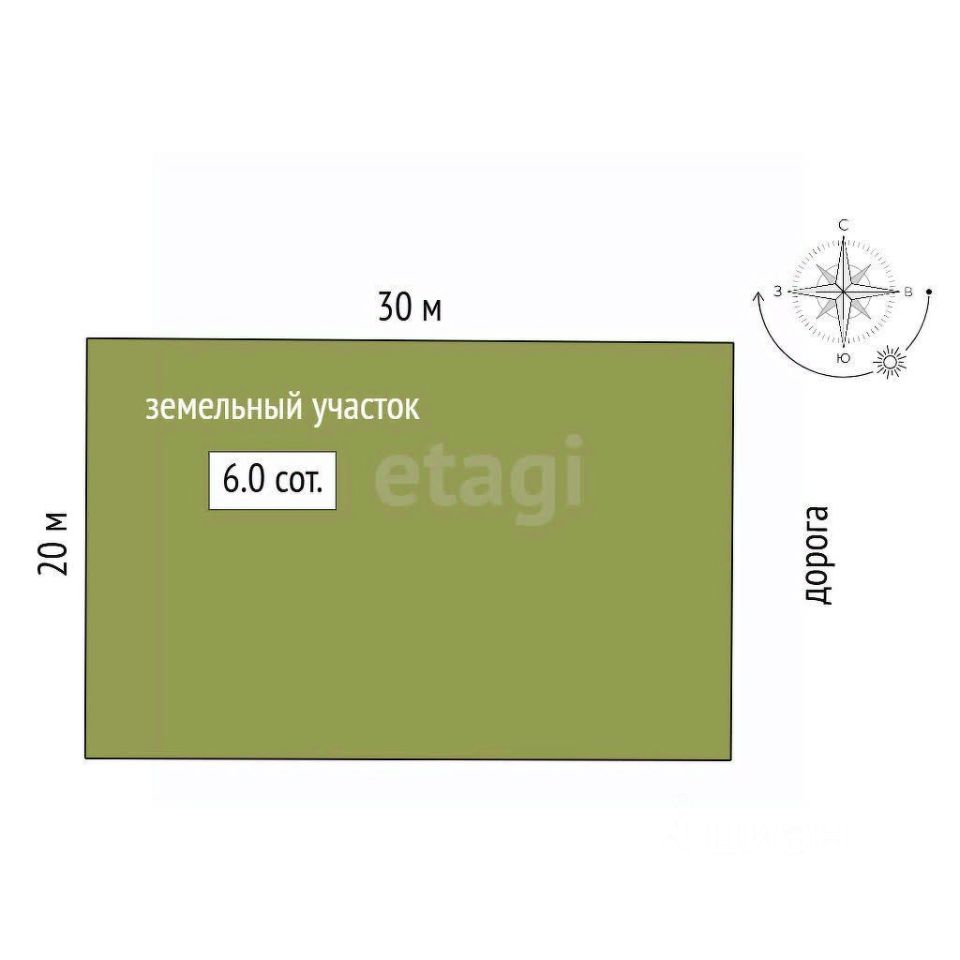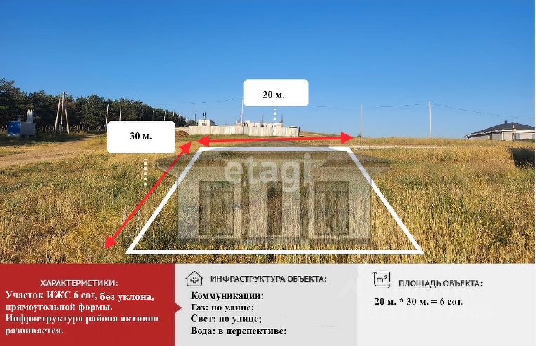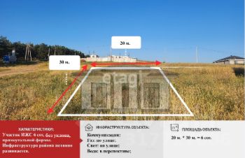 Земельный участок ровный, четырехугольной формы, площадь - 6 соток.