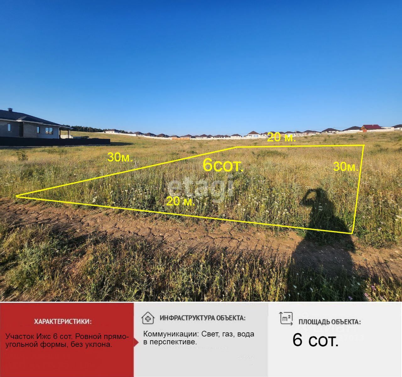Участок 6 соток, ровный, правильной формы, все коммуникации, под индивидуальное жилое строительство. Рядом расположено озеро, на участке голубые ели.
