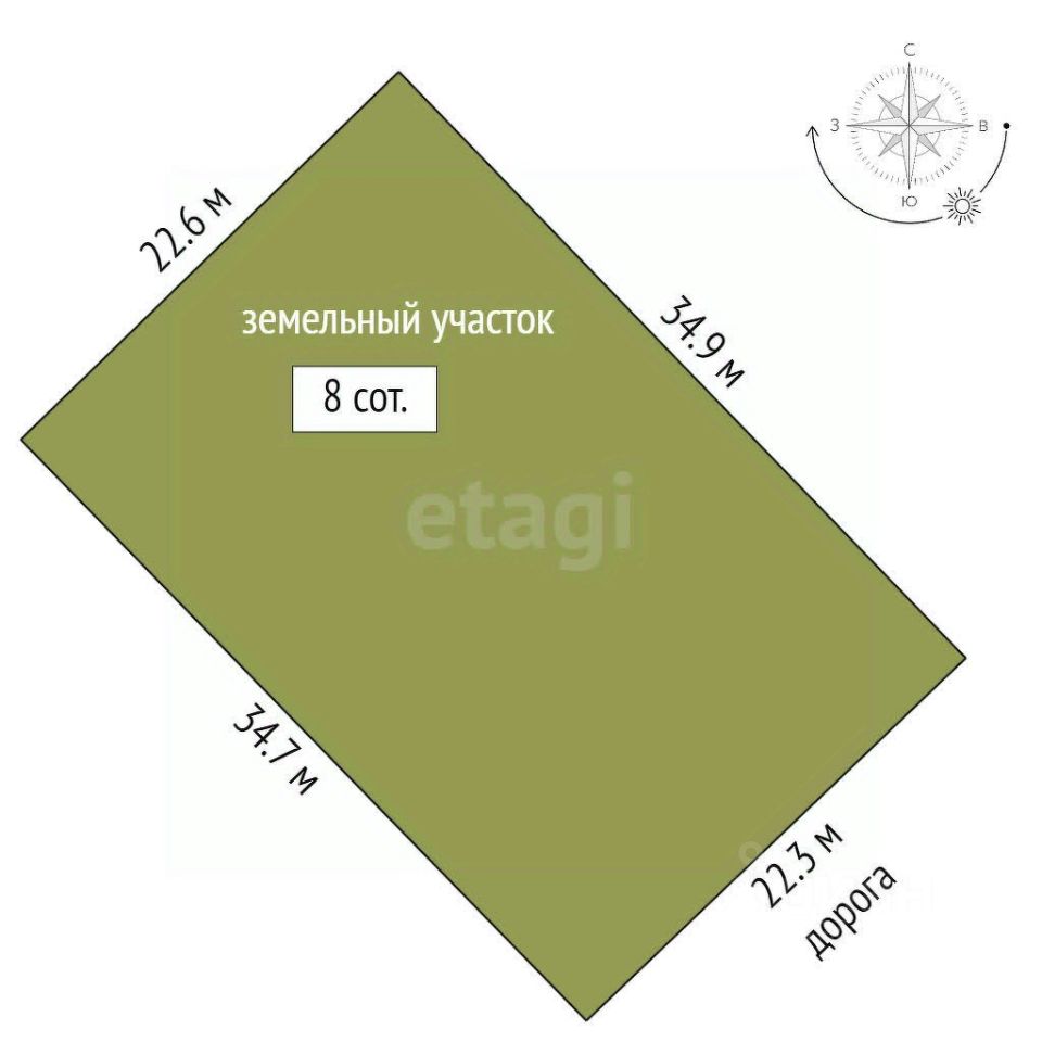 Площадь уточнённая - 8 соток, ИЖС, ровный, технические условия ещё не получены, но коммуникации рядом.