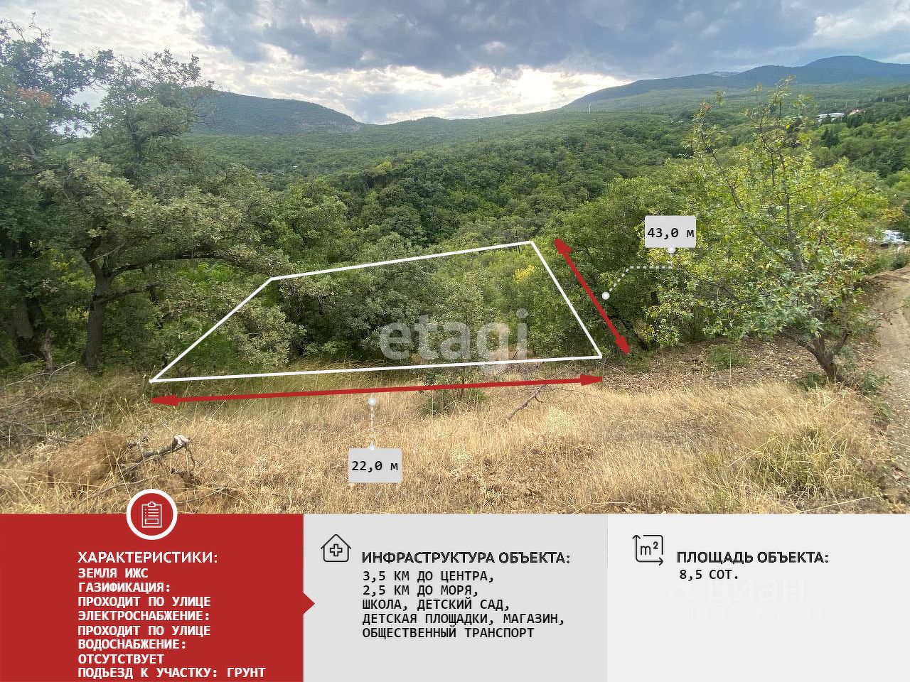 Участок 8,5 соток, непосредственной близости к Профессорскому уголку, расстояние до моря 1.5 км.