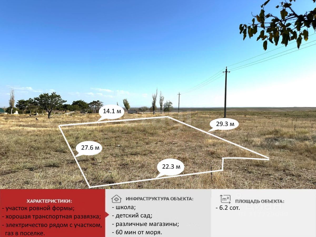 Предлагаем участок, площадью 6.3 сотки, близ с. Равнополье, Симферопольский район, расположенный в 25 км от столицы Крыма г. Симферополя и 7 км до моря. Ровный, прямоугольной формы.