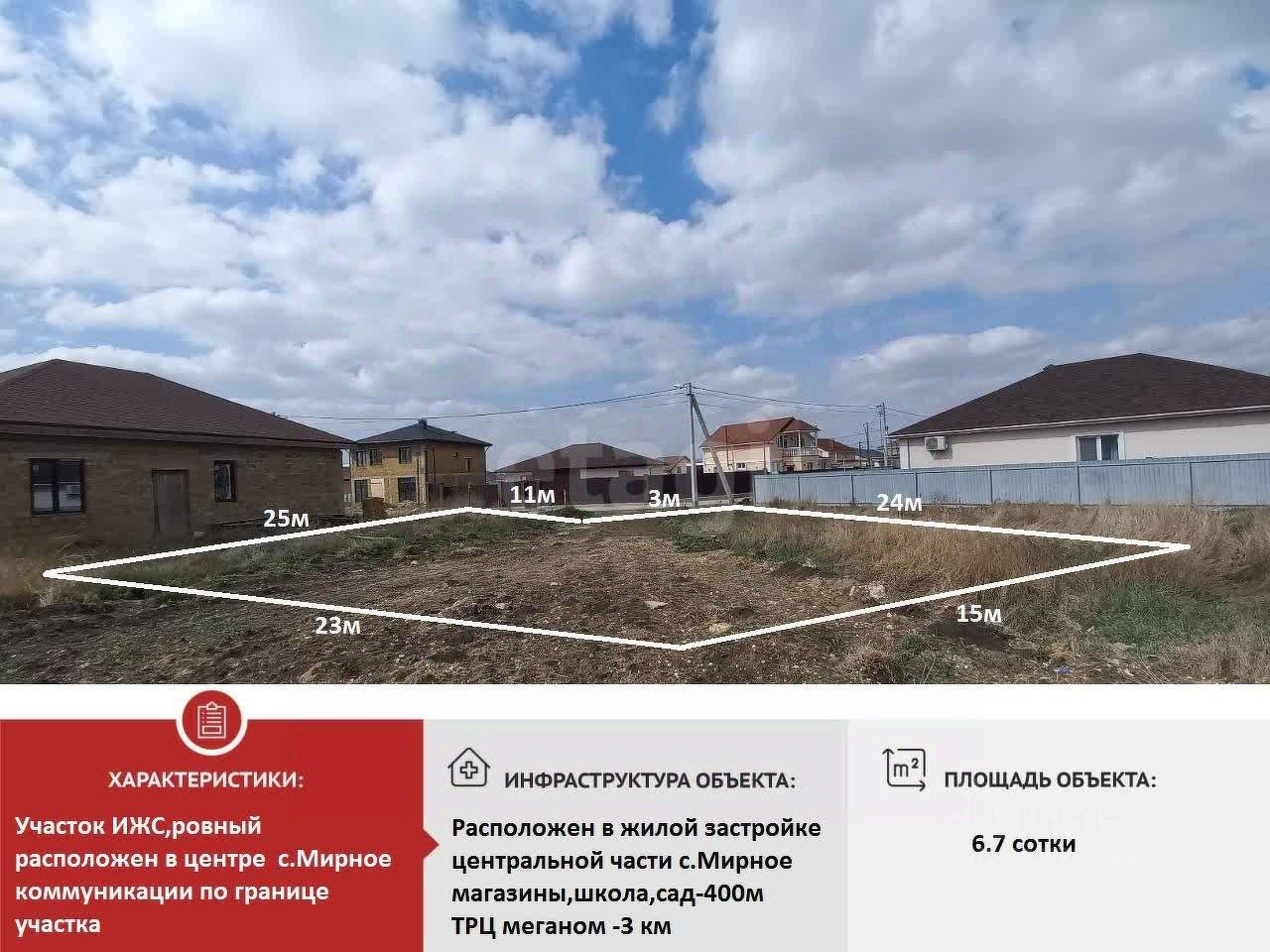 Ровный участок, ИЖС 6.7 соток находится в с. Мирном. Хорошие подъездные пути. Отличный вариант под постройку своего жилья! Удаленность от города 10 минут, до моря 30 минут езды на машине .