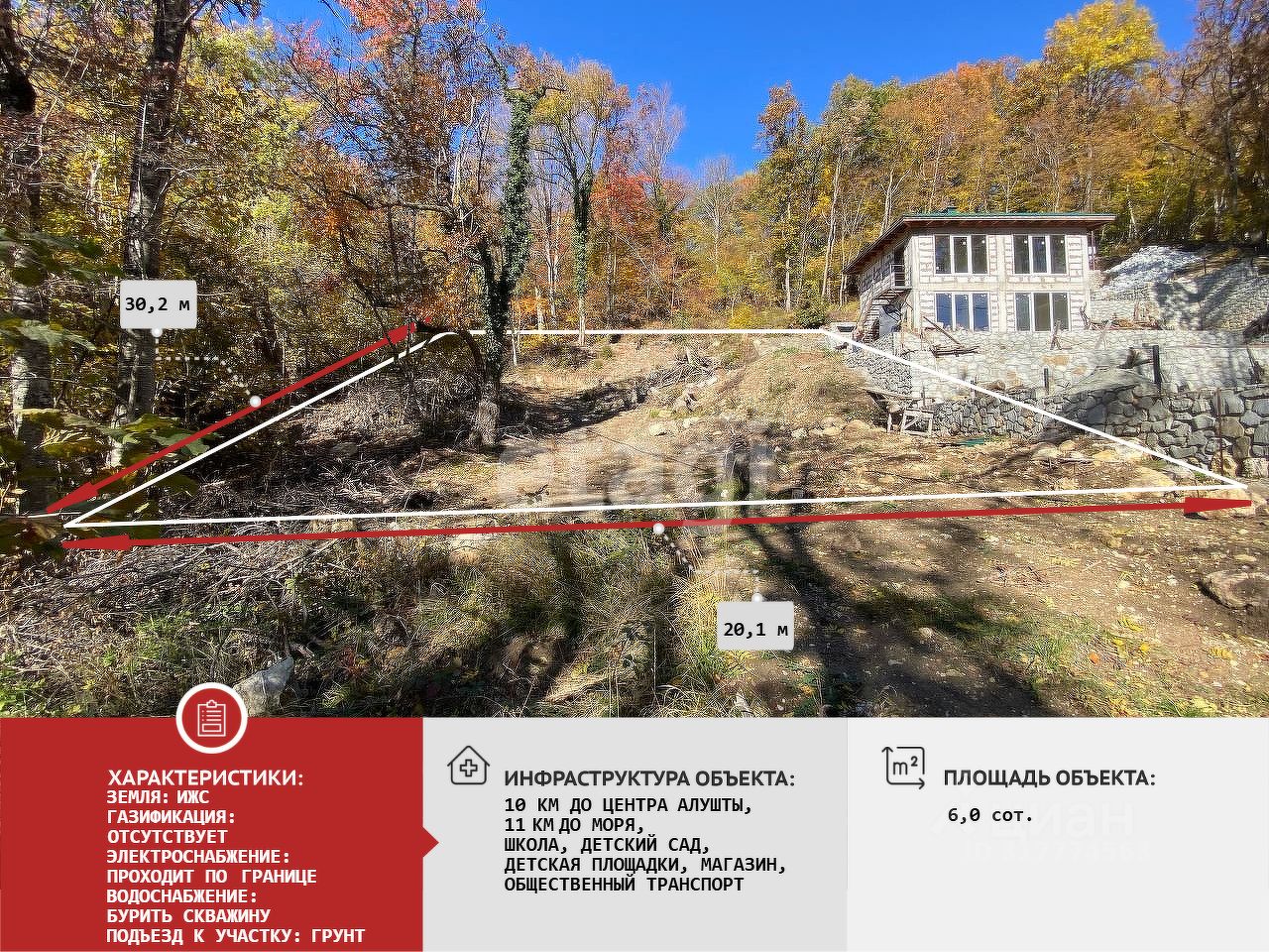 До центра Алушты можно добраться за 15-20 минут на автомобиле, что делает участок привлекательным как для постоянного проживания, так и для сезонного отдыха.