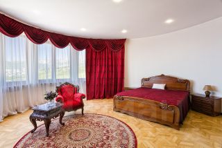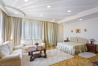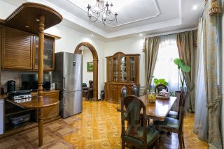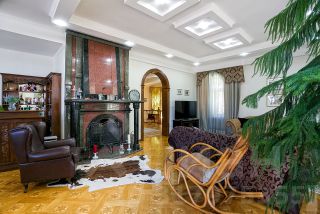 На первом этаже и во всех спальнях пол из натуральной паркетной доски, оконные рамы из натурального дерева. Вся мебель и межкомнатные двери изготавливались по индивидуальному заказу.