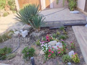 Просторный двор с парковочным местом, садом и зоной отдыха.