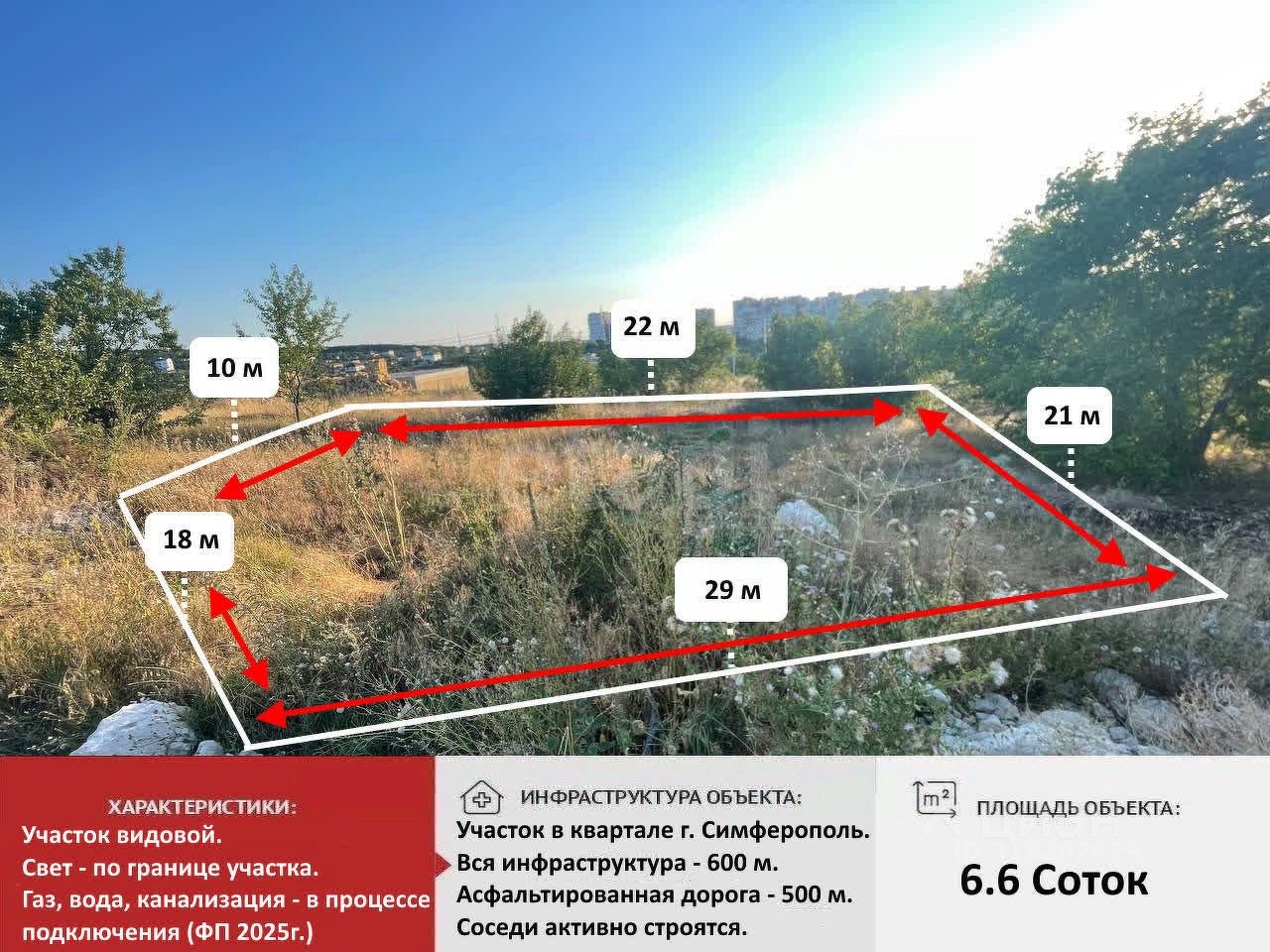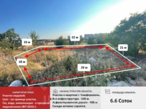 Площадь 6,6 соток. В 150 метрах от асфальтированной улицы Крылова, с видом на Пневматику. С минимальным уклоном.